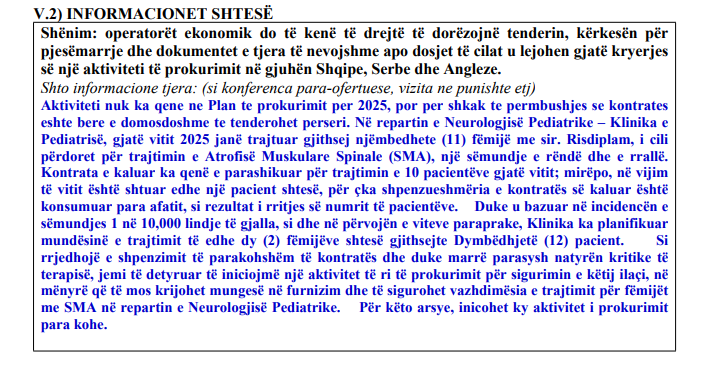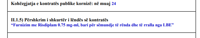 Sipas njoftimit zyrtar të ministrisë, kontrata e paraparë me titullin “Furnizim me risdiplam 0.75 mg/ml, bari për sëmundje të rënda dhe të rralla nga LBE”, me një kohëzgjatje prej 24-muajsh.
