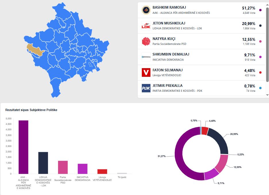 Nga numërimi i 62% të votave, kandidati i AAK-së, Bashkim Ramosaj po prin bindshëm duke shkuar drejt fitores pa balotazh me 51.27 (4846 vota), raporton IndeksOnline.