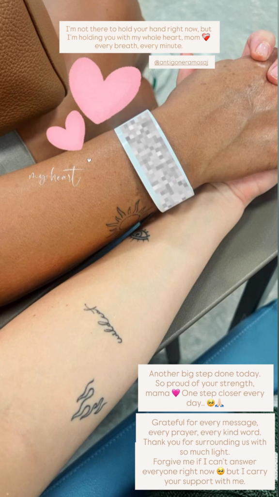 “Nuk jam aty për të ta mbajtur dorën tani, por po të mbaj me gjithë zemrën time, mami, me çdo frymë, çdo minutë. Edhe një hap i madh u bë sot. Jam shumë krenare për forcën tënde, mami. Çdo ditë një hap më afër.