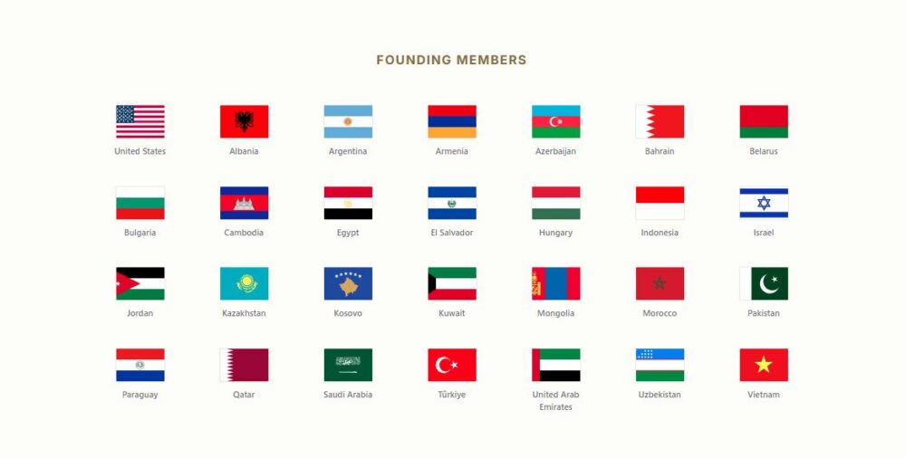 Në mesin e 28 shteteve themeluese që paraqiten në uebfaqe janë: Shtetet e Bashkuara të Amerikës, Shqipëria, Kosova, Turqia, Arabia Saudite, Katari, Emiratet e Bashkuara Arabe, Pakistani, Izraeli, Egjipti, Jordania, Kazakistani, Uzbekistani, Paraguai, Maroku, si dhe vende të tjera nga Evropa, Azia, Afrika dhe Amerika Latine.