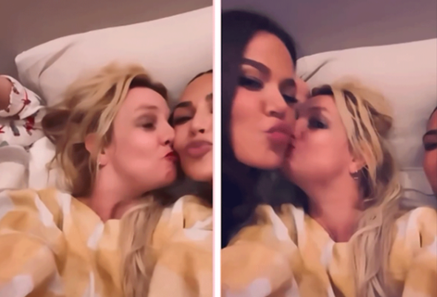 Britney Spears shihet në shtrat me Kimin dhe Klohen, teksa puthen e përqafohen