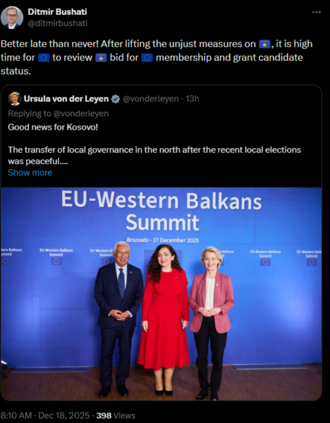 “Më mirë vonë se kurrë. Pas heqjes së masave të padrejta ndaj Kosovës, është koha që BE të rishikojë kërkesën e Kosovës për anëtarësim dhe t’i japë statusin e kandidatit”, ka shkruar Bushati në “X”.