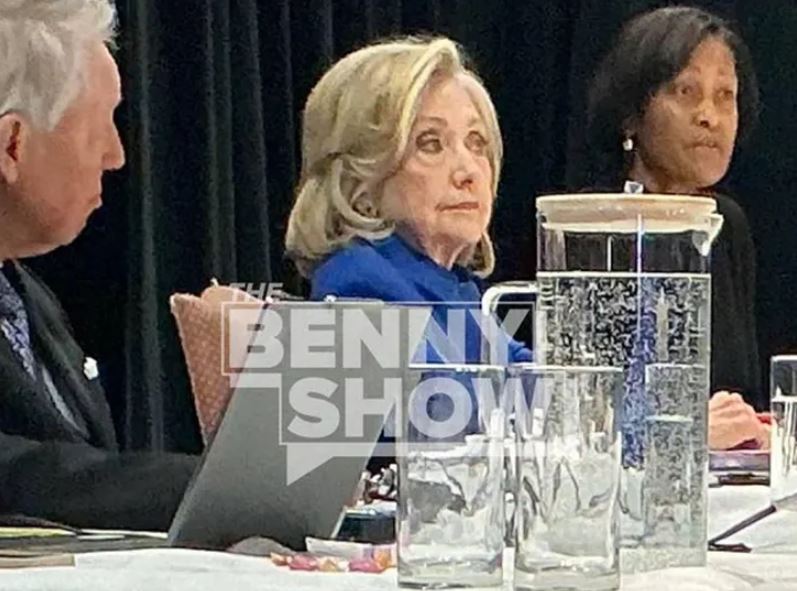 Në imazh, Clinton shihet e ulur në një tavolinë, e veshur me një kostum blu, e rrethuar nga disa persona të tjerë.