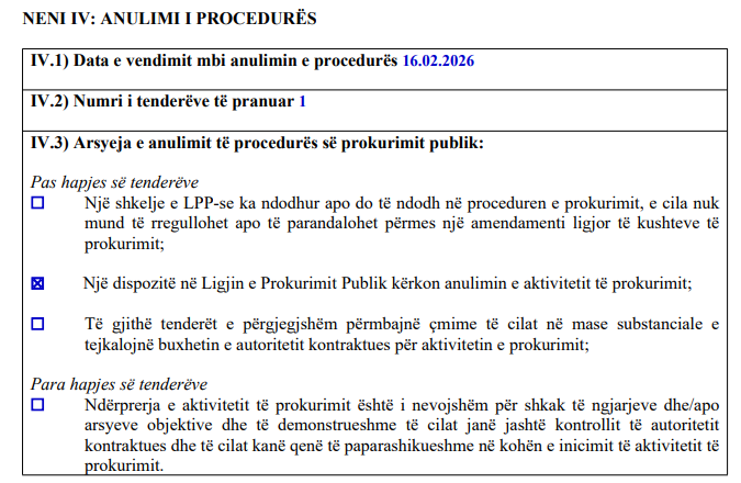“Një dispozitë në Ligjin e prokurimit publik kërkon anulimin e aktivitetit të prokurimit”, thuhet mes tjerash në arsyen e anulimit të procedurës së prokurimit publik.