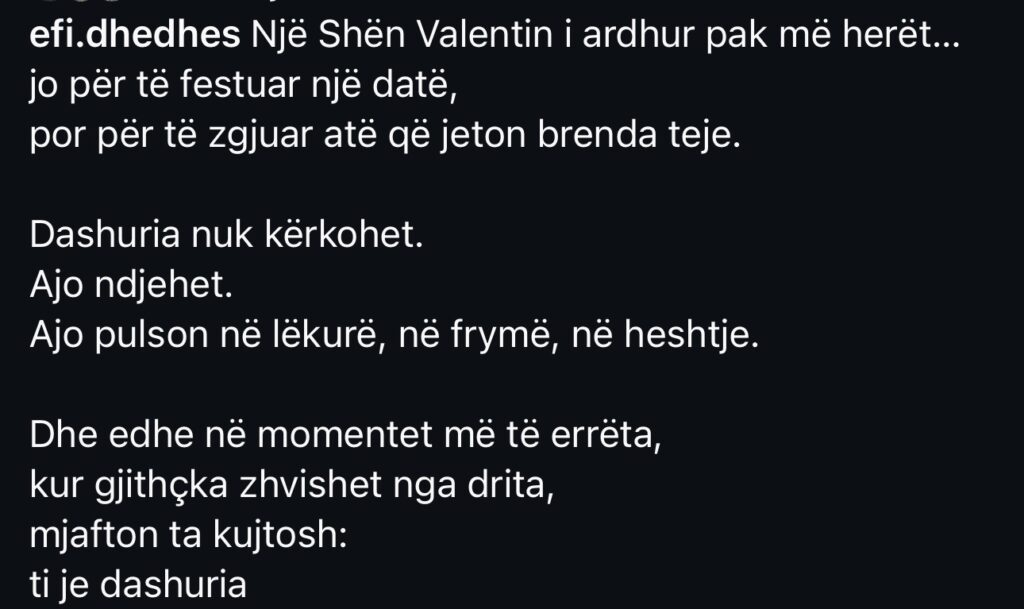 Influencerja e njohur Efi Dhedhes ka tërhequr vëmendjen me një postim të ri në rrjetet sociale, i publikuar përpara Shën Valentinit, shkruan IndeksOnline.