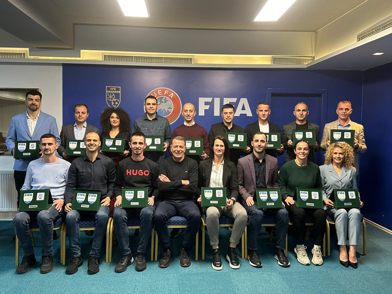 Presidenti Agim Ademi dhe kryetari i Komisionit të Gjyqtarëve, Përparim Hasani, sot kanë dorëzuar stemat e reja të FIFA-s për 16 gjyqtarë, në mesin e tyre edhe katër femra, Lumnije Muhadri, Florentina Kallaba, Rita Vehabi si dhe Fitore Govori.