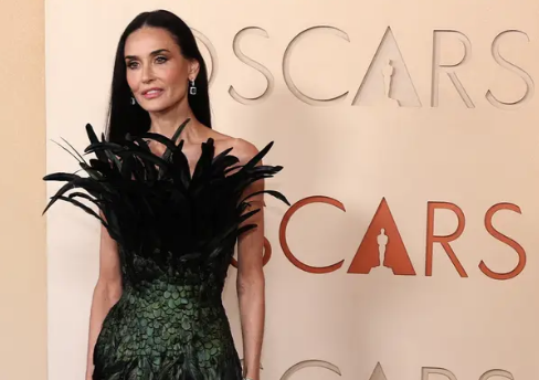 Aktorja Demi Moore dukej sikur kishte dalë direkt nga filmi Wicked, teksa mbante veshur një fustan me pupla të zeza dhe të gjelbra. Ajo e kombinoi pamjen me bizhuteri, përfshirë një palë vathë të varur.
