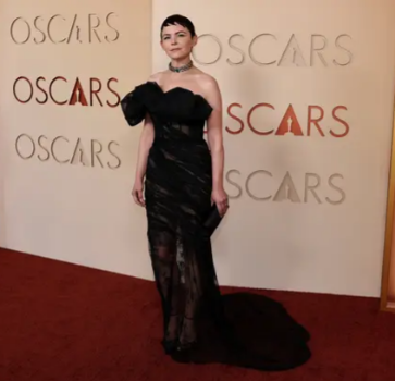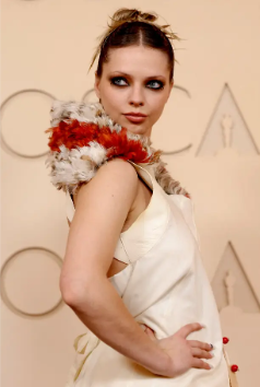 Maturën… apo jo? Aktorja Chase Infiniti mbërriti në Oscar me një fustan ngjyrë vjollcë me dekolte të ulët dhe një fund të palosur. Fustani kishte palosje në gjoks dhe në bel. Ajo e shoqëroi pamjen me bizhuteri, të cilat përfshinin një gjerdan argjendi dhe një byzylyk diamanti.