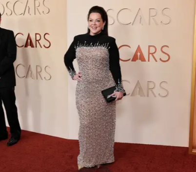 Princesha e akullit! Komediania Melissa McCarthy dukej sikur ishte gati për një garë patinazhi artistik me një fustan me detaje kristali, të mbuluar me një jakë të zezë me mëngë të gjata. Ajo i mbante flokët të mbledhura lart e poshtë dhe e plotësonte pamjen me vathë të mrekullueshëm.