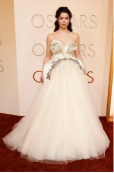 Paksa tepër! Aktorja Auli’i Cravalho dukej sikur do të shkonte në Met Gala, jo në Oscar, pasi mbante veshur një fustan krem pa rripa me një fund voluminoz prej tyli. Pjesa e sipërme ishte zbukuruar me dy trëndafila të mëdhenj, skulpturorë si buste, dhe ajo e kompletonte pamjen me dy varëse diamanti.