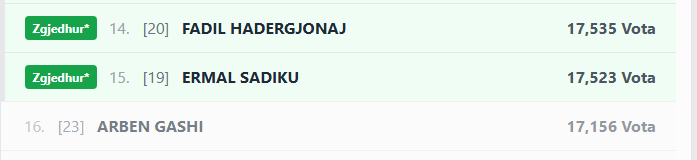 Momentalisht, Hadegjonaj radhitet i 14 me 17,533 Vota, Sadiku i 15 me 17,513 Vota, dhe Gashi i 16 ( jashtë kuvendit) me 17,154 Vota.