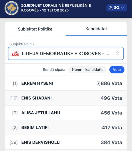 Lidhja Demokratike e Kosovës (LDK): Ekrem Hyseni udhëheq me 7,886 vota, ndjekur nga Enis Shabani me 496 vota, Alisa Jetullahu me 456 vota, Besim Latifi me 417 vota, Enis Dervisholli me 384 vota.