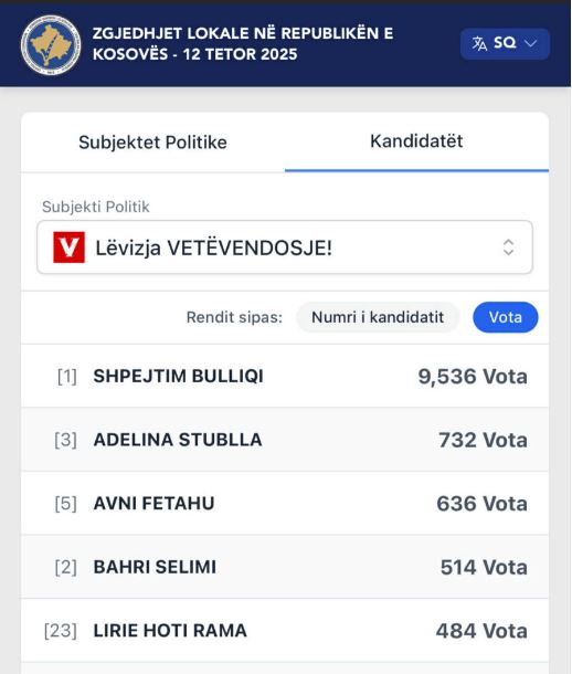 Lëvizja Vetëvendosje: Shpejtim Bulliqi udhëheq me 9,536 vota, ndjekur nga Adelina Stublla me 732 vota, Avni Fetahu me 636 vota, Bahri Selimi me 514 vota, Lirie Hoti Rama me 484 vota,.