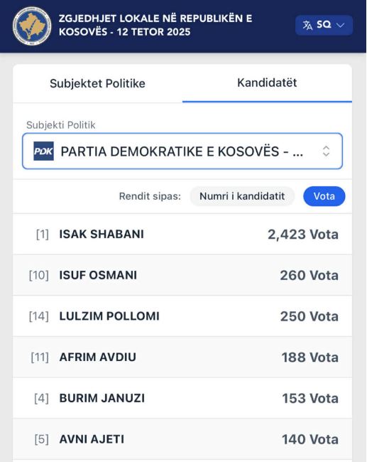 Partia Demokratike e Kosovës (PDK): Isak Shabani udhëheq me 2,423 vota, ndjekur nga Isuf Osmani me 260 vota, Lulzim Pollomi me 250 vota, Afrim Avdiu me 188 vota, Burim Januzi me 153 vota.