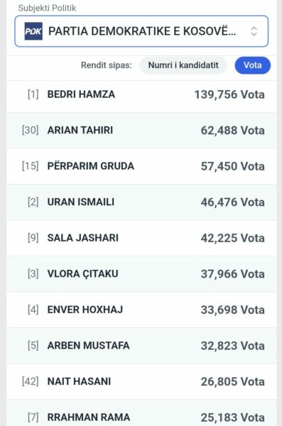 Sipas rezultateve të KQZ-së, në PDK më së shumti vota ka Bedri Hamza 139,642.
