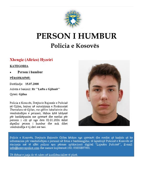 Sipas njoftimit të policisë, me autorizimin nga Prokuroria Themelorë e Gjilanit lëshuar kërkësë bashkëpunim me qytetarë dhe mediat për personin i cili që nga data 02.01.2026 është shpallur person i humbur dhe nuk dihet vendndodhja e tij deri me tani.
