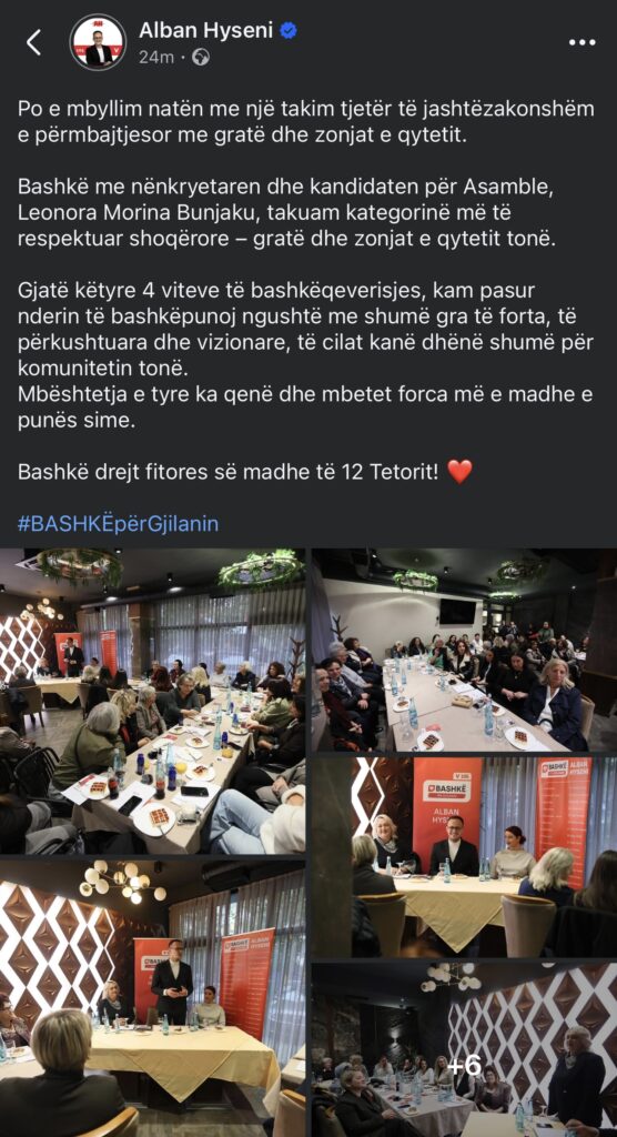 Kandidati për kryetar të Komunës së Gjilanit, Alban Hyseni, ka zhvilluar një takim me gratë dhe zonjat e qytetit, në kuadër të fushatës për zgjedhjet e 12 tetorit.