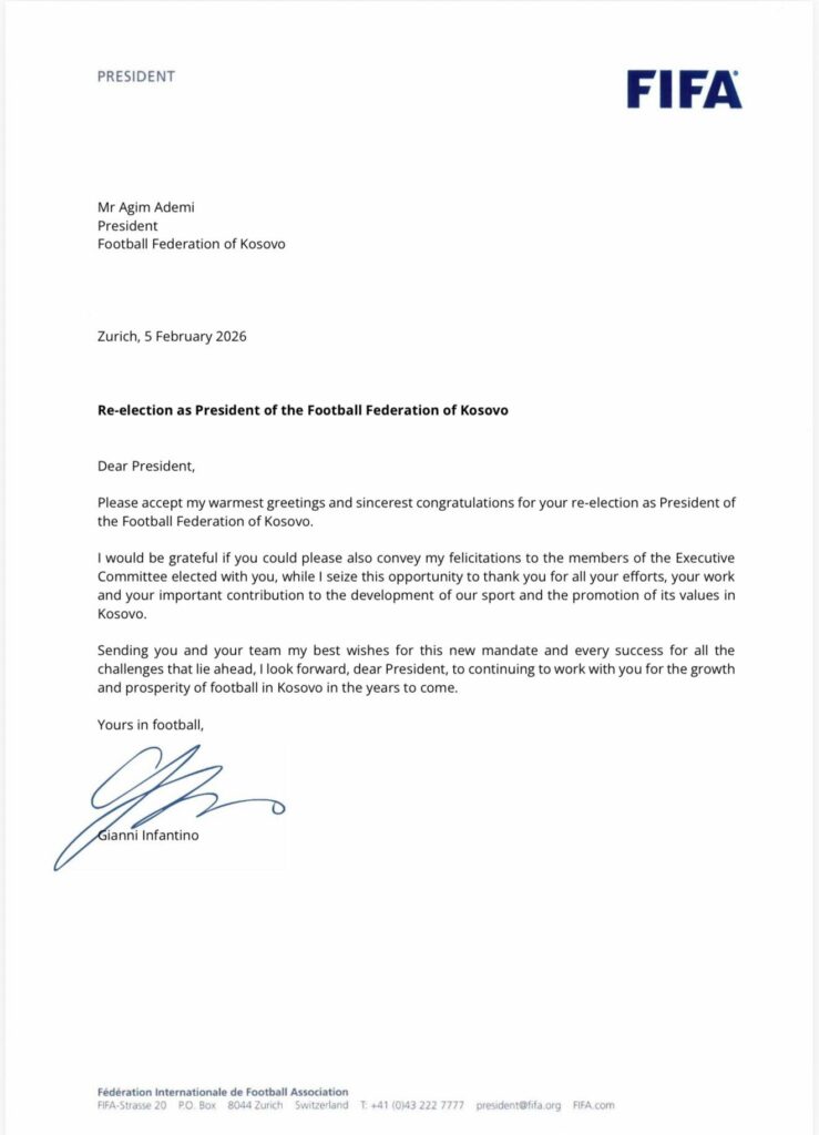 Ju lutem pranoni përshëndetjet e mia më të përzemërta dhe urimet më të sinqerta për rizgjedhjen tuaj si President i Federatës së Futbollit të Kosovës.