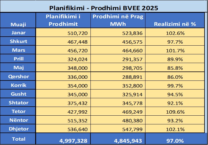 Korporata Energjetike e Kosovës – KEK Sh.A. njofton se, bazuar në bilancin vjetor energjetik të aprovuar nga Zyra e Rregullatorit për Energji (ZRRE), ka realizuar 97% të planit vjetor të prodhimit të energjisë elektrike për vitin 2025, pavarësisht sfidave teknike dhe ndërhyrjeve kapitale për modernizimin e njësive gjeneruese.