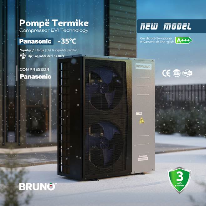 Me kompresorin e avancuar PANASONIC dhe teknologjinë EVI (Enhanced Vapor Injection), kjo pompë termike garanton efikasitet të lartë dhe funksionim të qëndrueshëm edhe në temperatura deri në –35°C.