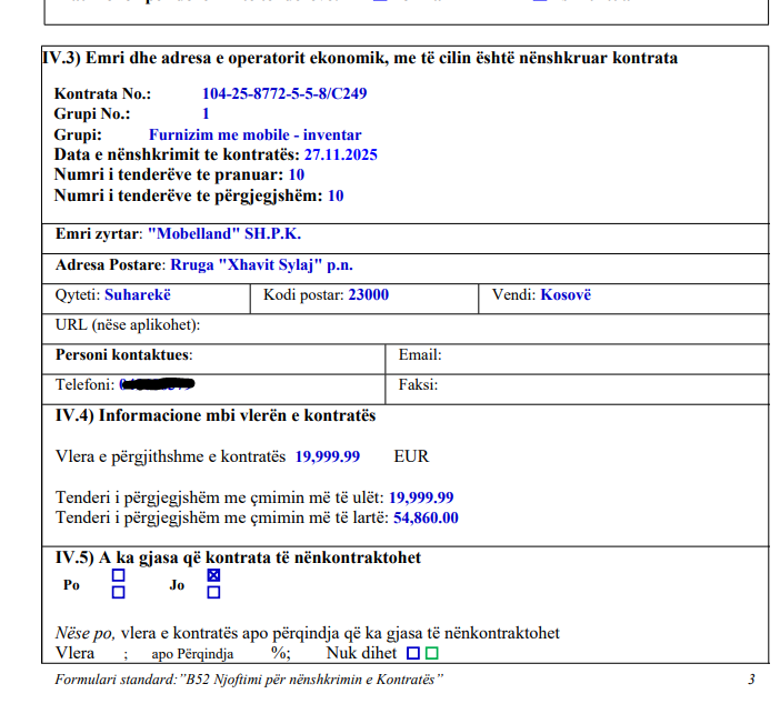 Vlera përfundimtare e kontratës është 19,999.99 euro, me çmimin më të ulët se sa që ishte planifikuar.