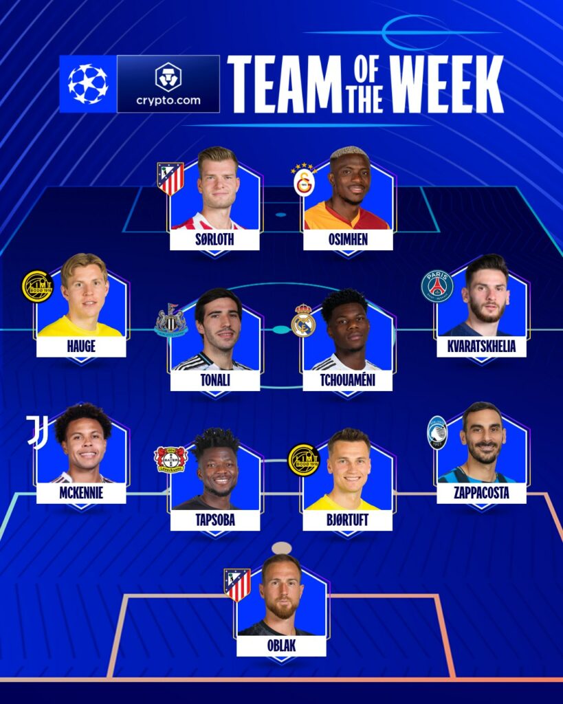 Formacioni më i mirë: Oblak, Zappacosta, Bjortuft, Tapsoba, McKennie, Tchouameni, Tonali, Kvaratskhelia, Hauge, Osimhen, Sorloth./IndeksOnline/