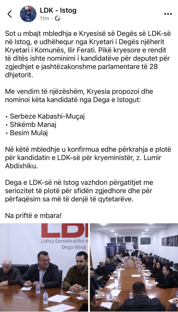 Me vendim unanim, Kryesia e degës ka zyrtarizuar tre kandidatët që do të përfaqësojnë Istogun në garën zgjedhore:Serbeze Kabashi-Muçaj, Shkëmb Manaj, Besim Mulaj.