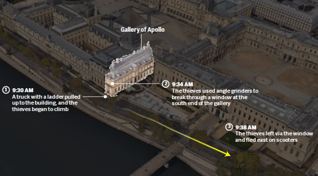 Autoritetet thonë se banda që hyri në Luvër qëndroi më pak se katër minuta brenda. Duke përdorur një ashensor mallrash të sjellë pranë fasadës që shikon nga lumi Sena, hajdutët hapën një dritare, thyen dy kuti ekspozimi dhe u larguan me motorë drejt qendrës së Parisit.