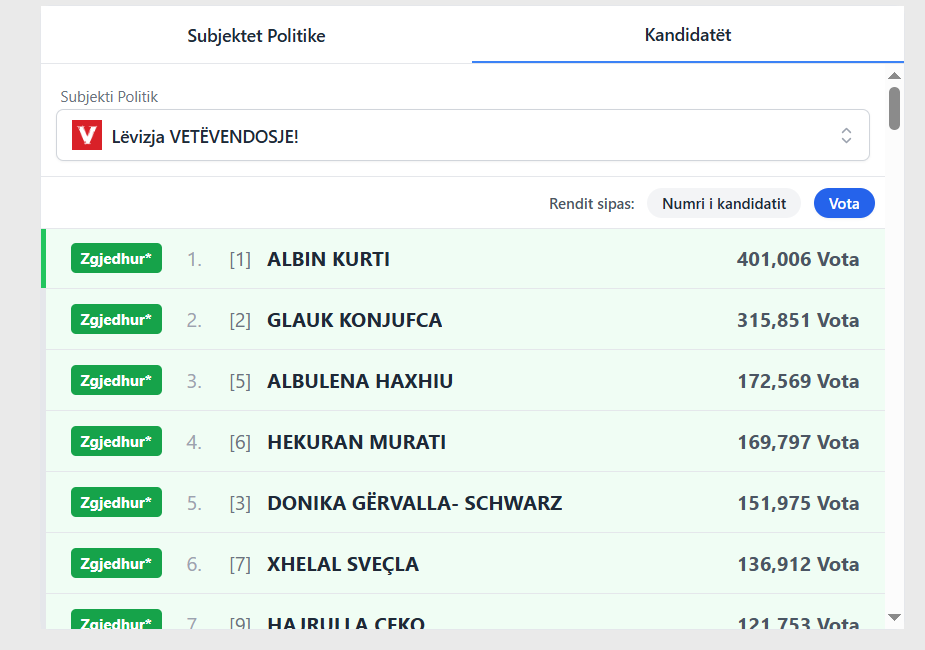 Kandidati për kryeministër nga kjo parti, Albin Kurti, ka marrë mbi 400 mijë vota, duke thyer rekordin si personi më i votuar në historinë e Kosovës.