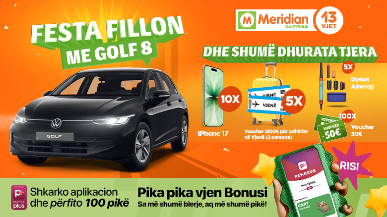 Festa e ditëlindjes së 13-të të Meridian Express, e nisur më 1 tetor, po vazhdon të sjell për klientët çmimet më të lira në mbi 150 artikuj në baza javore dhe një kampanjë shpërblyese madhështore me dhurata të shumta – përfshirë preminë kryesor, një Golf 8! Kampanja do të zgjasë deri më 14 janar 2026.