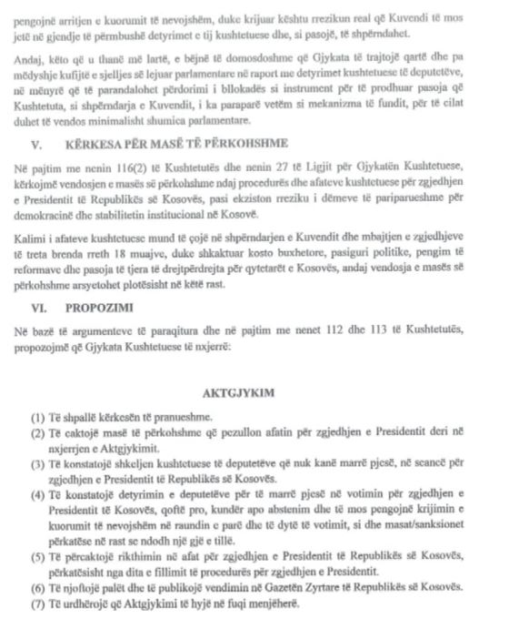 Po ashtu, përmes kësaj kërkese, kemi kërkuar që Gjykata Kushtetuese të vendosë masë të përkohshme për pezullimin e afatit kushtetues që lidhet me procedurën e zgjedhjes së Presidentit, deri në publikimin e aktgjykimit.