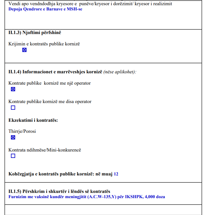 Përmes kësaj kontrate, Instituti Kombëtar i Shëndetësisë Publike të Kosovës (IKSHPK) do të furnizohet me 4,000 doza vaksine. Operatorët ekonomikë të interesuar duhet të ofrojnë vaksina të autorizuara për qarkullim dhe përdorim të paktën në një shtet anëtar të Bashkimit Evropian (BE).