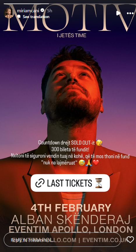 E bashkëshortja e Albanit, Miriam Cani në rrjetet sociale ka postuar reklamën duke thënë se kanë mbetur vetëm edhe 300 bileta.