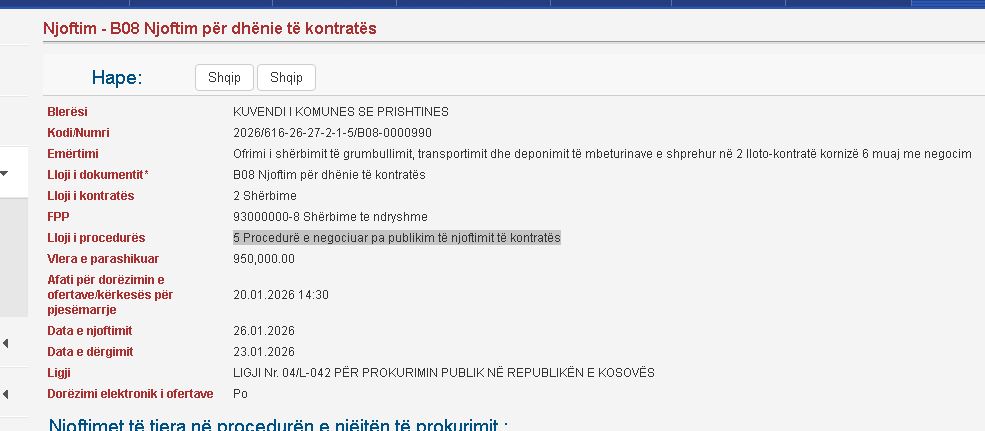 Ky tender vjen në kohën kur Komuna e Prishtinës po përballet me sfida në menaxhimin e mbeturinave dhe sigurimin e vazhdimësisë së shërbimeve publike në kryeqytet.