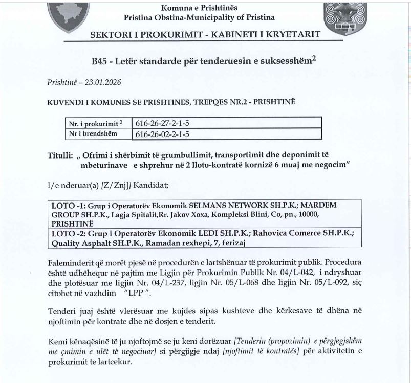 Sipas të dhënave të publikuara: Loti 1 për ofrimin e shërbimit të grumbullimit, transportimit dhe deponimit të mbeturinave është fituar nga Selmans Network & Mardem Group.