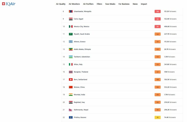 Kryeqyteti i Kosovës, Prishtina, po renditet sonte e 22-ta në botë sa i përket ndotjes së ajrit.