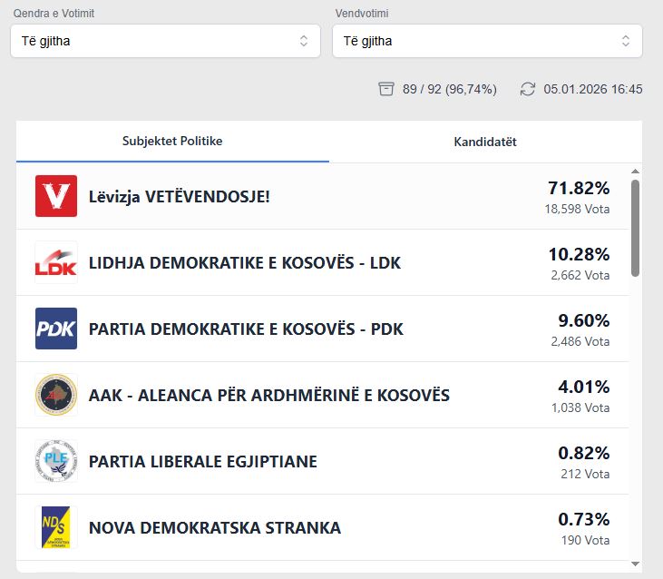 LVV që ka fituar 71.81 për qind, LDK mbetet e dyta dhe në vend të tretë është PDK-ja. Në anën tjetër, AAK ka marrë mbi 1 mijë vota apo 4.01%.