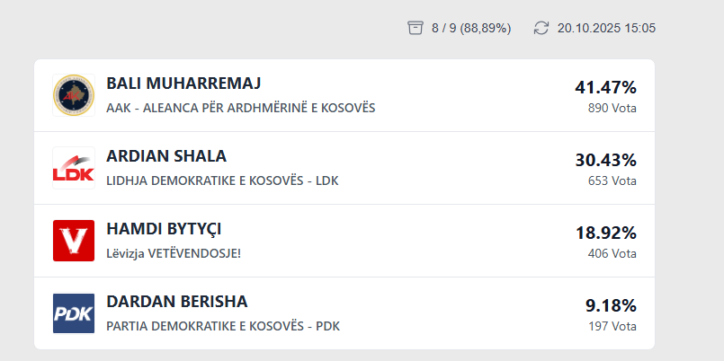 Janë numëruar afër 90% të votave me postë në komunën e Suharekës. Më së shumti vota ka Bali Muharremaj i AAK-së 897 vota apo 41.47%.