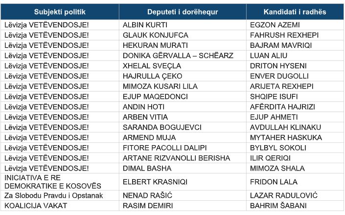 për zgjedhjet e përgjithshme, rekomandon 18 kandidatët e radhës, të certifikuar në zgjedhjet e parakohshme për Kuvendin e Republikës së Kosovës, të cilat janë mbajtur më 28 dhjetor 2025, sipas tabelës vijuese: