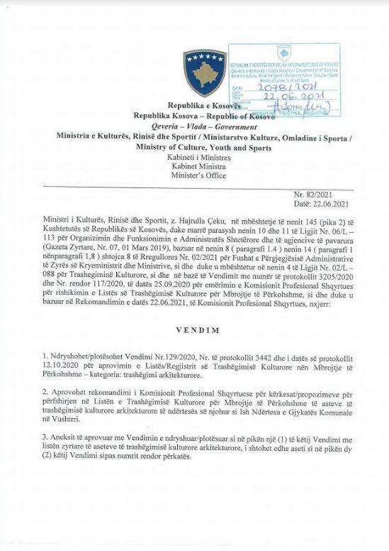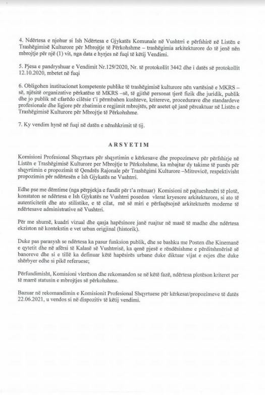 Në pajtueshmëri me Nenet 3 dhe 4 të Ligjit Nr.02/L-088 për Trashëgimi Kulturore, sot në Listën e Trashëgimisë Kulturore nën Mbrojtje të përkohshme është shtuar Ndërtesa e ish-Gjykatës në Vushtrri.