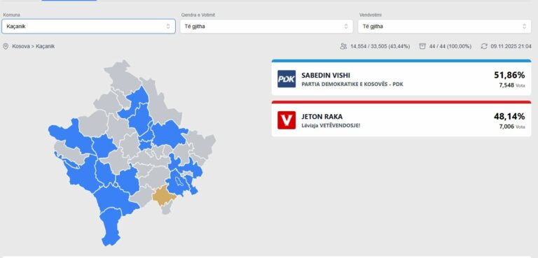 Sipas rezultateve të KQZ-së, fitues i Kaçanikut është Sabedin Vishi i Partisë Demokratike të Kosovës.