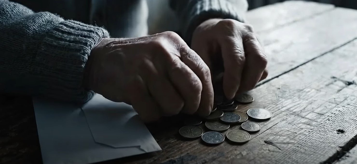 Në video shfaqet një i moshuar teksa numëron paratë mbi tavolinë, ndërsa mesazhi shoqërues thotë: “Pensionistë që mezi mbijetojnë. Keq, Albin.”
