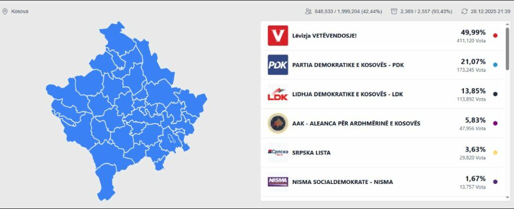 Lëvizja Vetëvendosje ka rënë nën 50%. Partia e Kurtit aktualisht ka 49.99%.