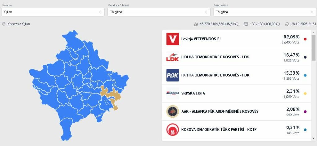 Sipas rezultateve të publikura nga KQZ, Vetëvendosje ka fituar me 62.09%, apo 29 mijë e 495 vota, e pasuar nga LDK me 16.47%, PDK ka dal partia e tretë me 15.33%. /IndeksOnline/