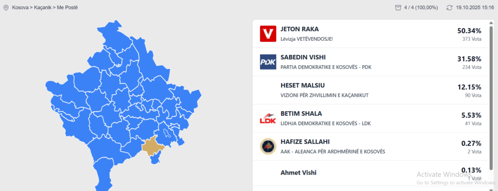 Ndërsa nga rezultatet preliminare të KQZ-së, Vishi prin në Kaçanik me 40.02% të votave, derisa Raka radhitet i dyti me 37.38%. /IndeksOnline/