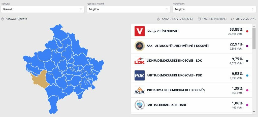 Sipas rezultateve të publikura nga KQZ, Vetëvendosje ka fituar me 53.88%, e pasuar nga AAK me 22.97%, LDK ka dal partia e tretë me 9.75%, ndërsa partia e katër në Gjakovë për nga numri i votave ka dal PDK me 9.58%. /IndeksOnline/