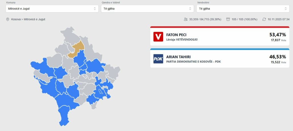 Sipas rezultateve të fundit, kandidati i Lëvizjes Vetëvendosje, Faton Peci, ka fituar zgjedhjet me 53,47 për qind të votave, ose gjithsej 17,837 vota.