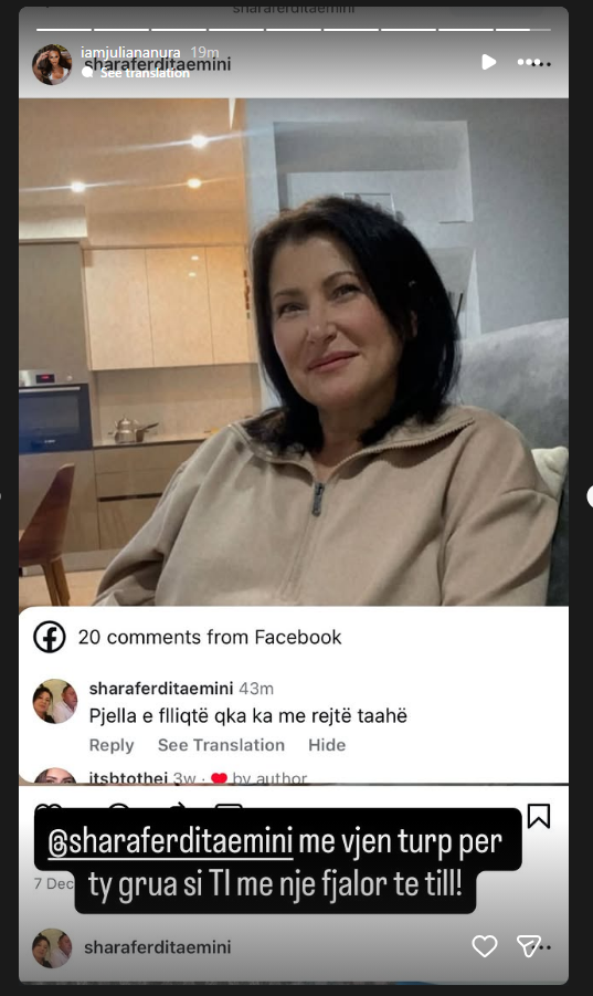 Komentuesja shkroi: “Pjella e flliqtë qka ka me rrejtë tashë”, ndërsa Xhuli iu përgjigj duke shprehur turp dhe zhgënjim për gjuhën e përdorur: “@sharaferditaemini me vjen turp per ty grua si Tl me një fjalor të tillë”!