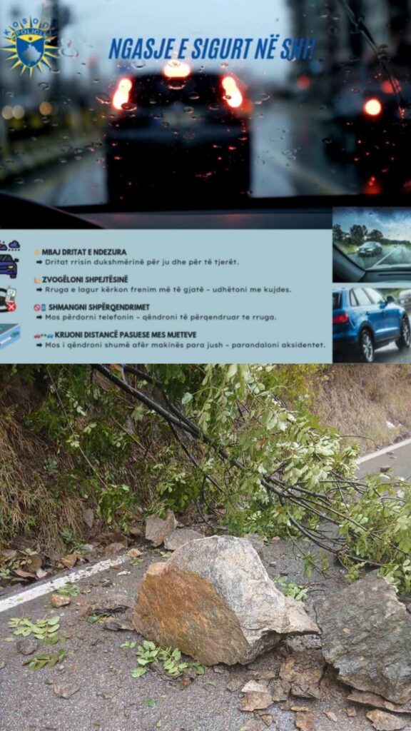 Kushtet aktuale të motit me shi kanë shkaktuar rrugë të lagështa, dukshmëri të kufizuar dhe rrezik të shtuar për aksidente trafiku.