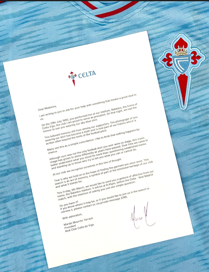 E dashur Madonna, po të shkruaj për të të kërkuar ndihmën tënde me diçka që do të thotë shumë për ne. Më 29 korrik 1990, ti performove drejtpërdrejt në stadiumin tonë, Balaídos, shtëpia e Celta Vigos, klubit të cilit jam krenare t’i shërbej si presidente. Atë natë, patëm nderin të të shihnim të veshur me fanellën tonë blu qielli.